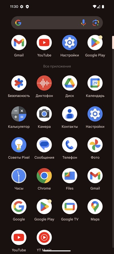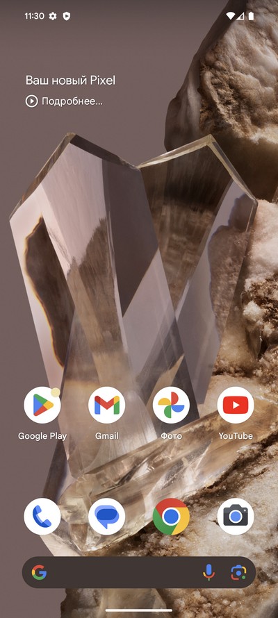 Чистый Android 14. Главный десктоп и установленные в системе приложения.