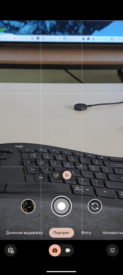 Интерфейс камеры. Снизу идут режимы, кнопка съемки, переключение между основной камерой, сверхшириком, цифровым 2-кратным зумом и оптическим 5-кратным, сверху - дополнительные настройки.