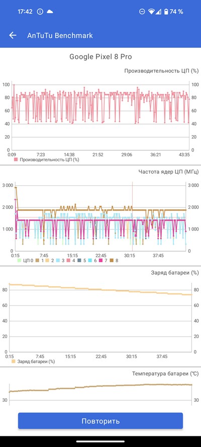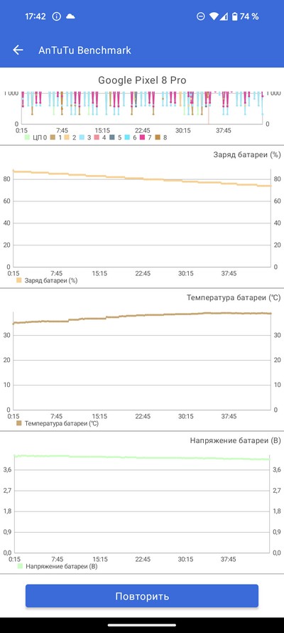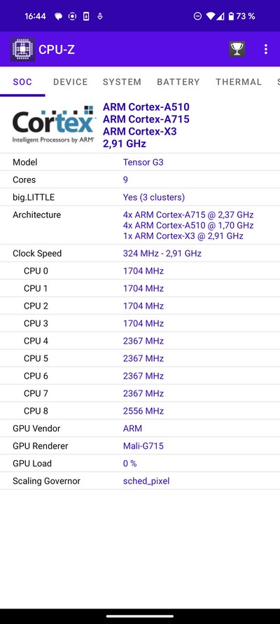 Платформа: Google Tensor G3 (4 nm), Nona-core (1x3.0 GHz Cortex-X3 & 4x2.45 GHz Cortex-A715 & 4x2.15 GHz Cortex-A510)
