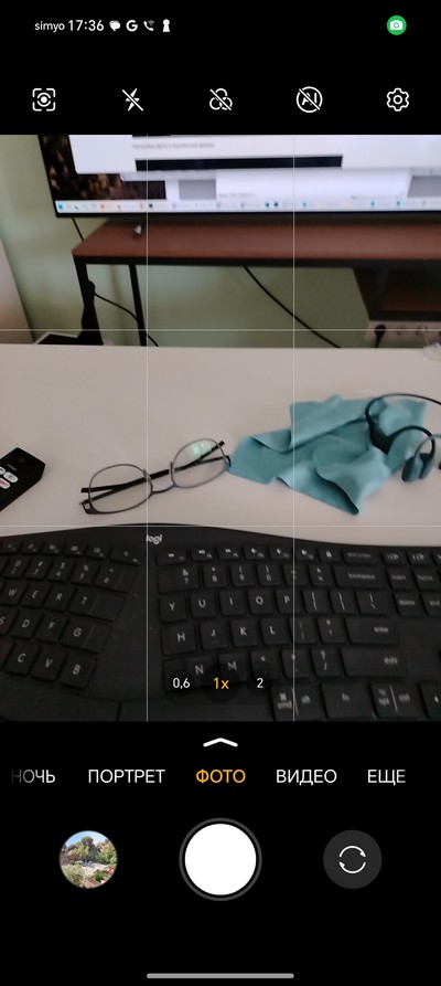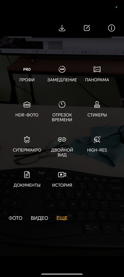 Интерфейс камеры. Снизу идут режимы, кнопка съемки, переключение между основной камерой, сверхшириком и цифровым 2-кратным зумом, сверху - пиктограммы дополнительных настроек.