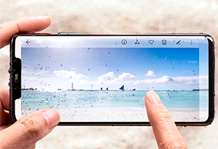 Здесь ожидаемо хорошие олеофобное покрытие и антибликовый фильтр, благодаря которому изображение на прямых солнечных лучах неплохо различимо.