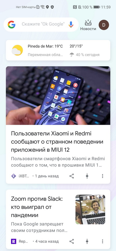 Лента новостей/виджетов Google, настройка быстрых переключателей.