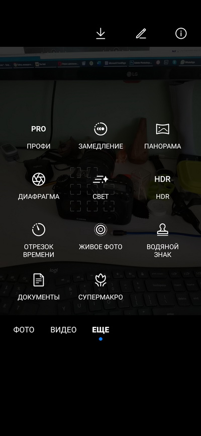Интерфейс камеры. Снизу идут разнообразные режимы. По ссылке "Еще" появляются дополнительные режимы.