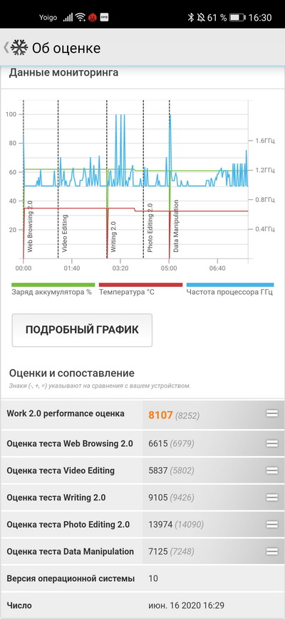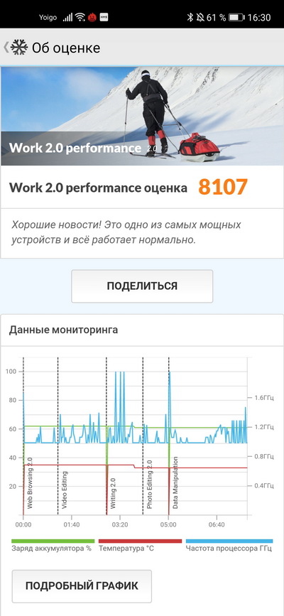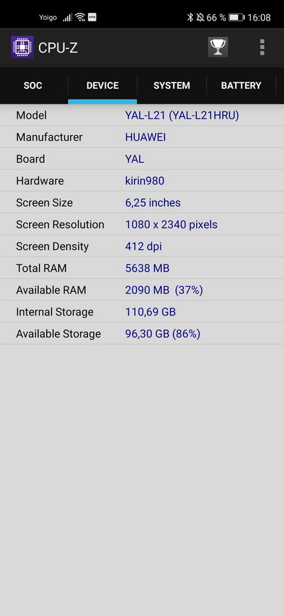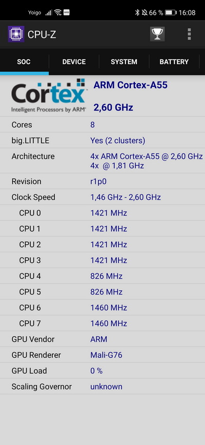 Платформа: Huawei Kirin 980, 8 ядер (2 × Cortex-A76 2,6 ГГц + 2 × Cortex-A76 1,92 ГГц + 4 × Cortex-A55 1,8 ГГц)