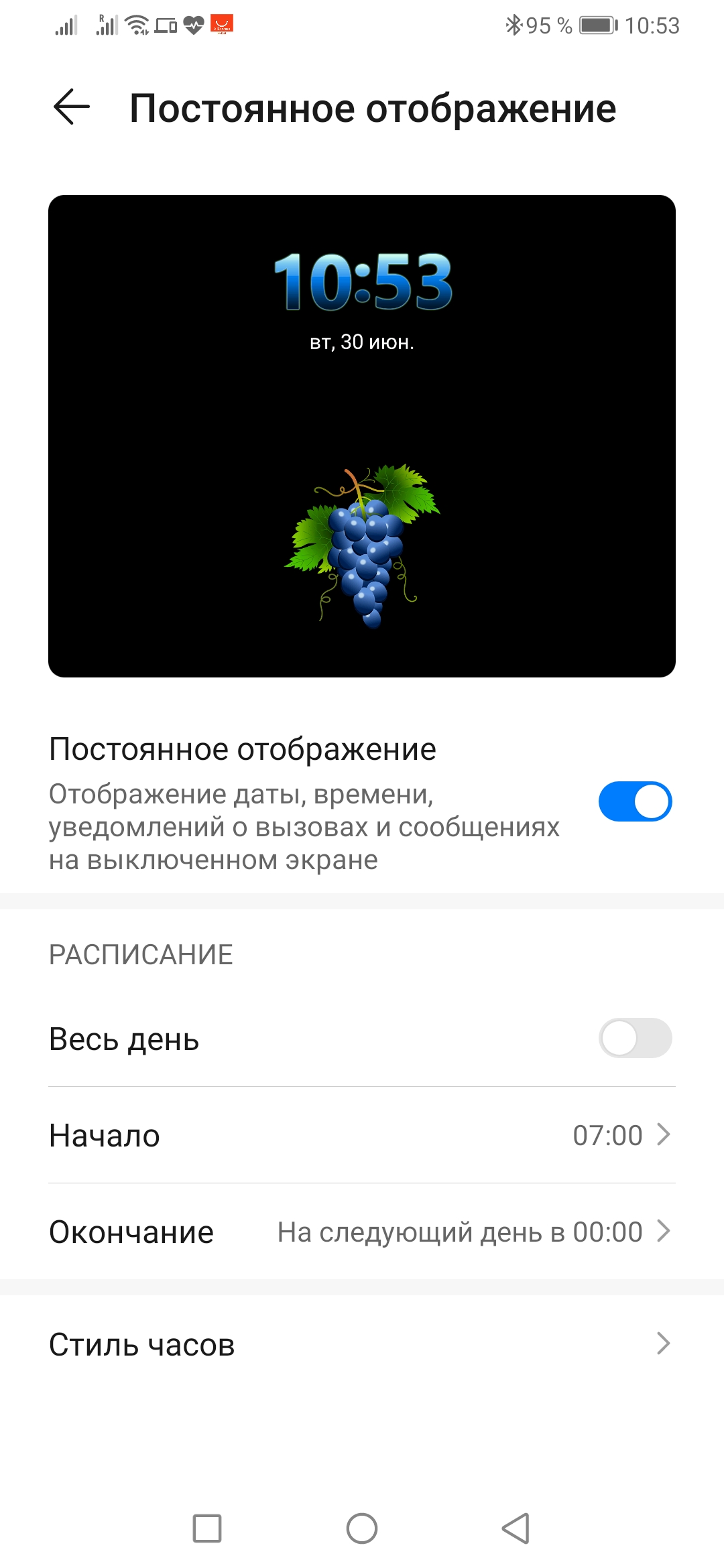 Настраиваемый режим постоянно включенного экрана. Стиль часов настраивается.