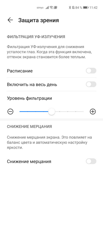 Есть фильтрация ультрафиолетового излучения, снижение мерцания. Можно включить темный режим, однако расписания для его включения нет, а некоторым пользователям это нужно.