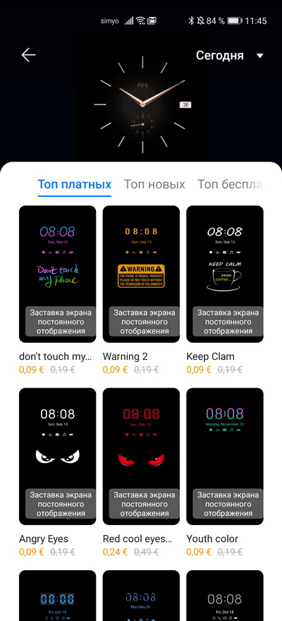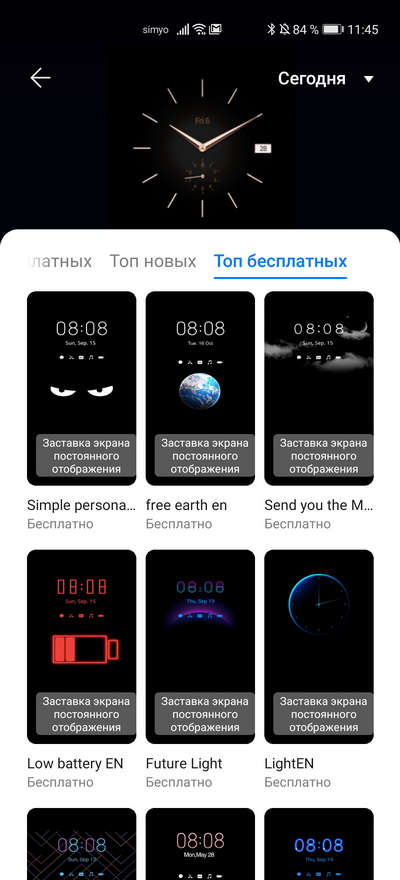 Также есть магазин часов для постоянно включенного экрана, где очень много различных вариантов - как бесплатных, так и платных. (На P30 Pro, оказывается, теперь такое тоже есть.)