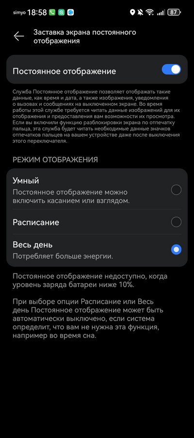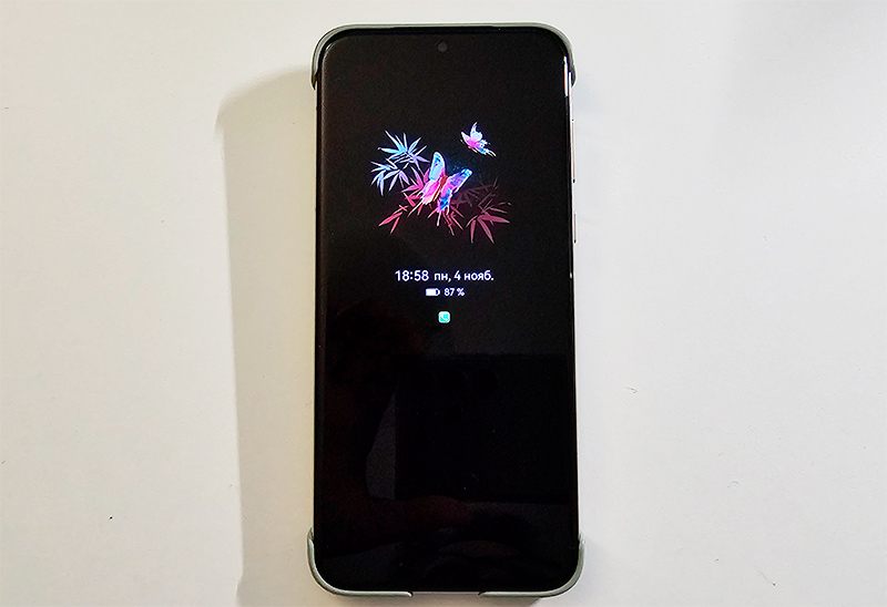 Режим AOD. "Умный" режим через некоторое время экран гасит и включает при прикосновении или когда вы смотрите на экран. Но можно включить режим постоянного отображения, и там много всяких вариантов.