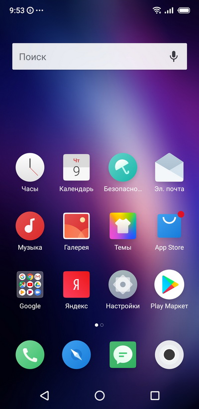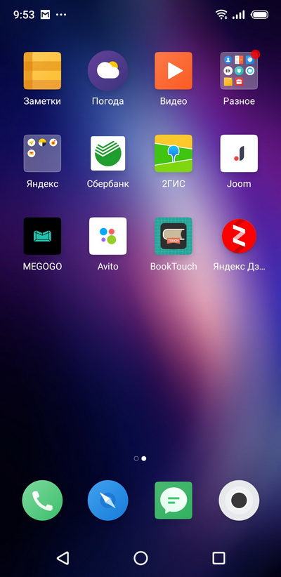 Android 8.1, оболочка Flyme 7. Главный десктоп и установленные в системе приложения.