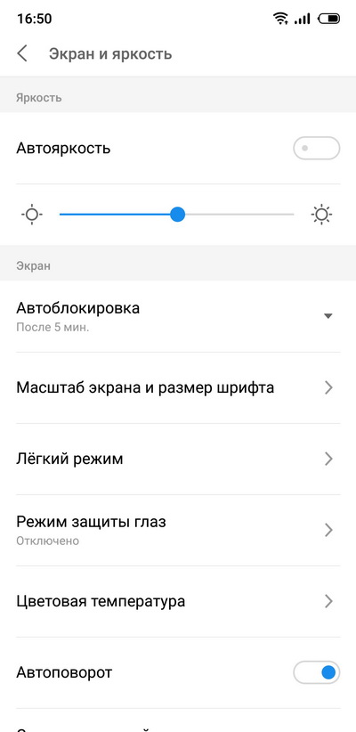 Настройки дисплея: можно менять масштаб и размер шрифта, есть упрощенный режим и режим защиты глаз. Также можно настраивать цветовую температуру.