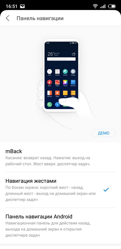 Управление здесь трех вариантов: стандартные андроидные экранные кнопки, управление с помощью многофункциональной кнопки mBack или с помощью андроидных жестов.