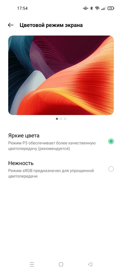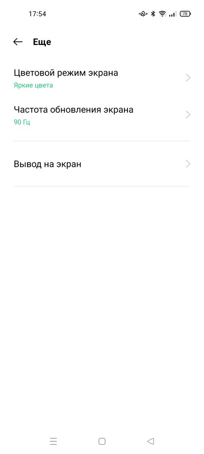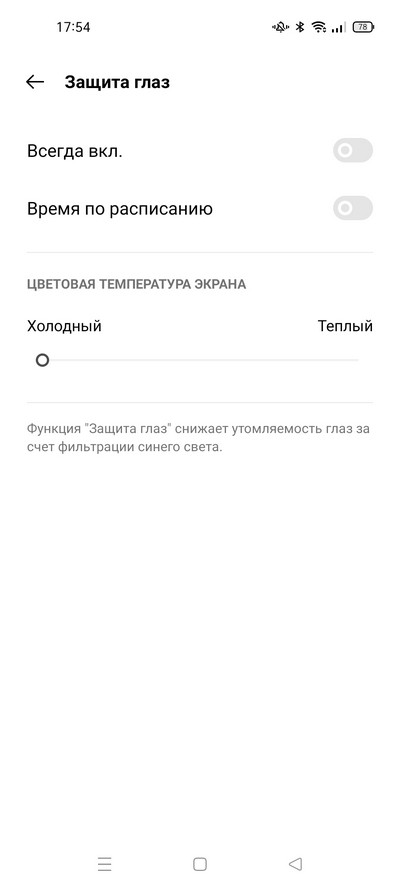 Настройки дисплея достаточно разнообразны, и в них есть все что полагается: светлый и темный режимы, режим защиты глаз с расписанием, цветовой режим экрана и цветовая температура.