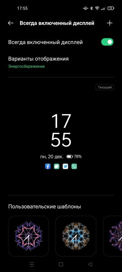 Также есть режим всегда включенного дисплея (AOD) и вид которого настраивается, и режим работы настраивается: всегда включен, по расписанию, энергосбережение (включается на 10 секунд).