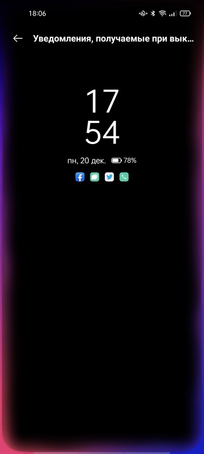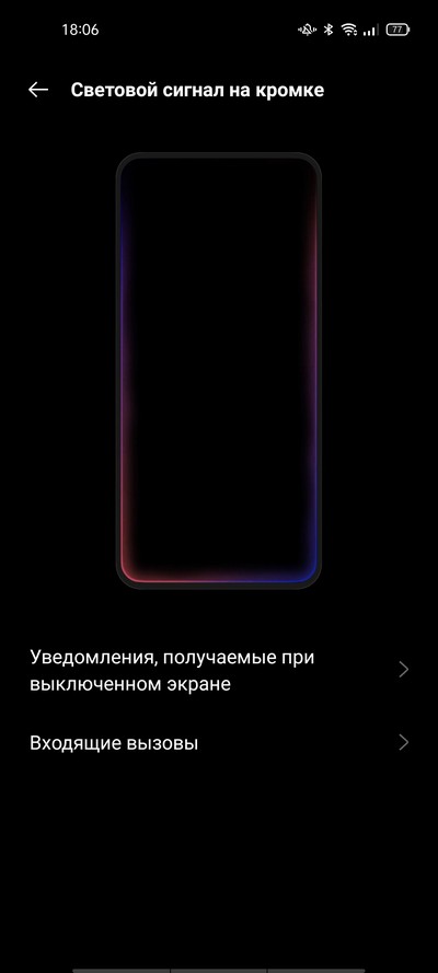 Светового индикатора на дисплее здесь нет, однако есть очень удобный режим светового индикатора на кромке, который намного лучше, чем малюсенький индикатор на дисплее. И вы этот режим можете настраивать.