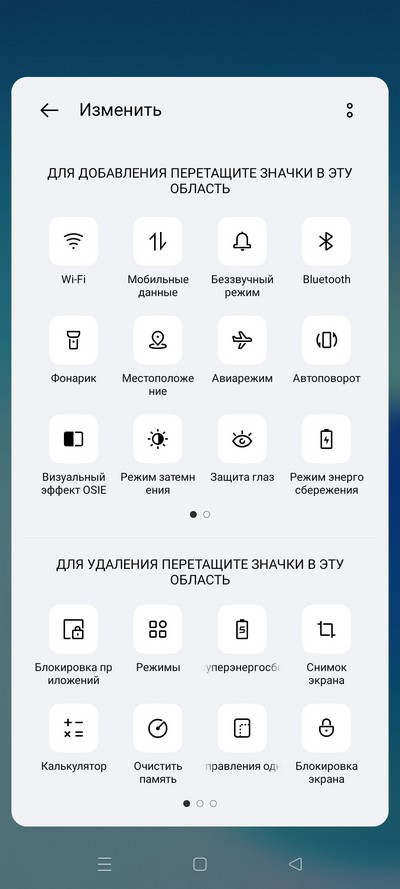 Главный экран, настройка области быстрых переключателей.