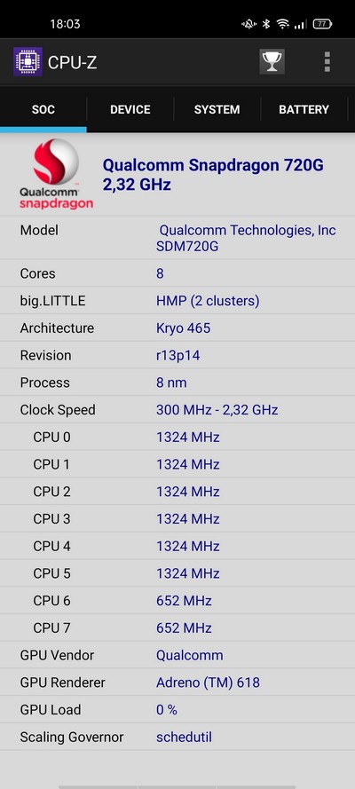 Процессор: Qualcomm SM7125 Snapdragon 720G (8 nm), Octa-core (2x2.3 GHz Kryo 465 Gold & 6x1.8 GHz Kryo 465 Silver)