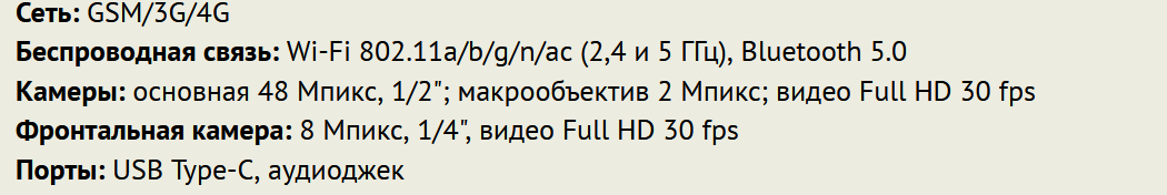 Камеры: основная 48 Мпикс, 1/2"; макрообъектив 2 Мпикс; видео Full HD 30 fps