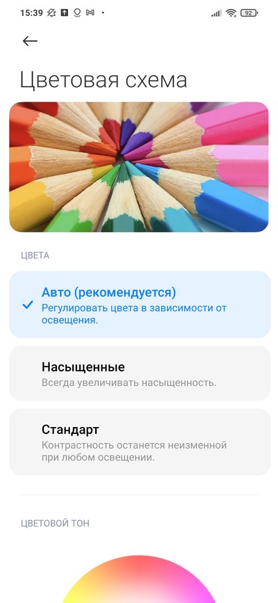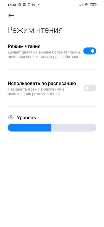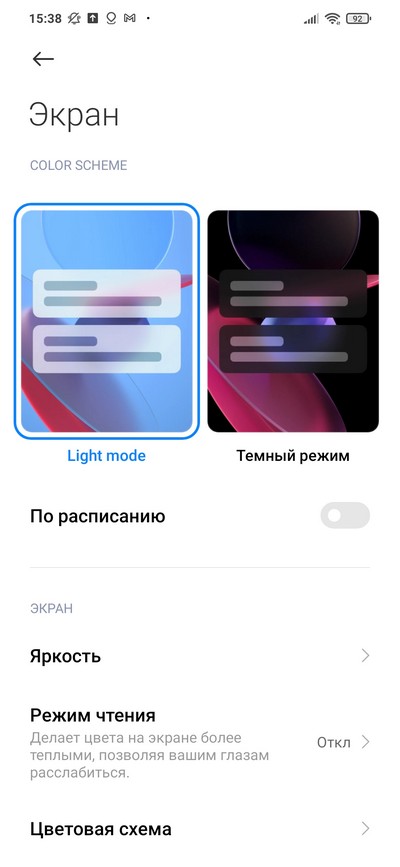 Есть темный режим и режим чтения, который можно включать по расписанию.