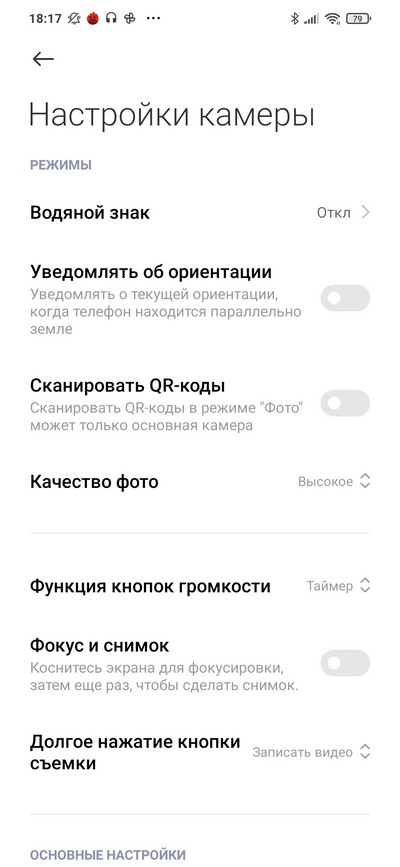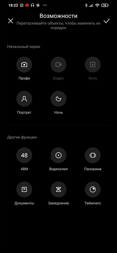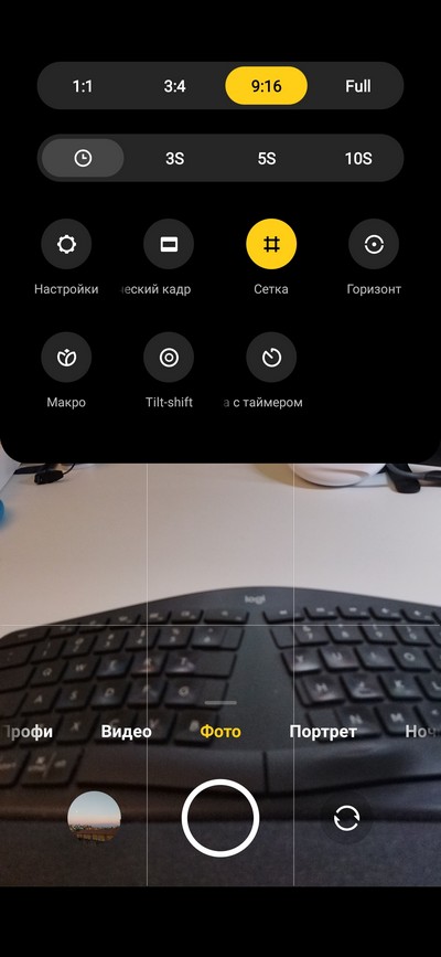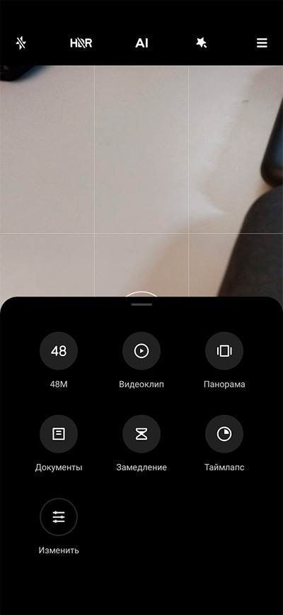 Снизу скроллируются режимы съемки, в выезжающей шторке есть дополнительные режимы, включая высокое разрешение 48 Мпикс. Режимы на основном экране можно настраивать.