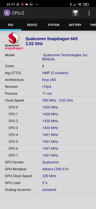 Процессор: Qualcomm Snapdragon 662 (11 нм), Octa-core (4 × 2,0 ГГц Kryo 260 Gold & 4 × 1,8 ГГц Kryo 260 Silver)