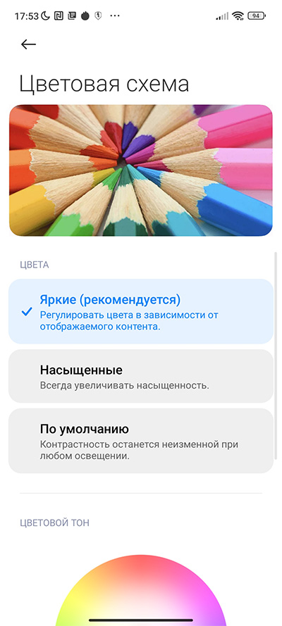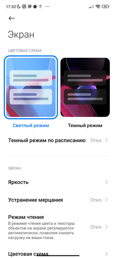 Настройки дисплея - стандартные для MIUI 12. Есть темный режим и режим чтения, который можно включать по расписанию. Настраиваются цветовая схема и размер текста. Вырез можно скрывать - в том числе и в отдельных приложениях.