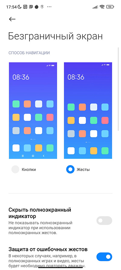 Стандартные варианты управления для MIUI: экранные кнопки и жесты, дополнительные жесты.