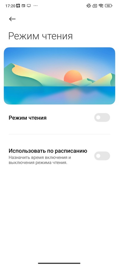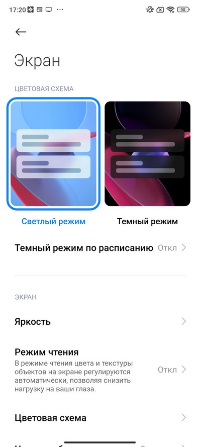 Настройки дисплея. Есть светлый и темный режимы, режим чтения (теплые цвета), настраиваемый по расписанию.