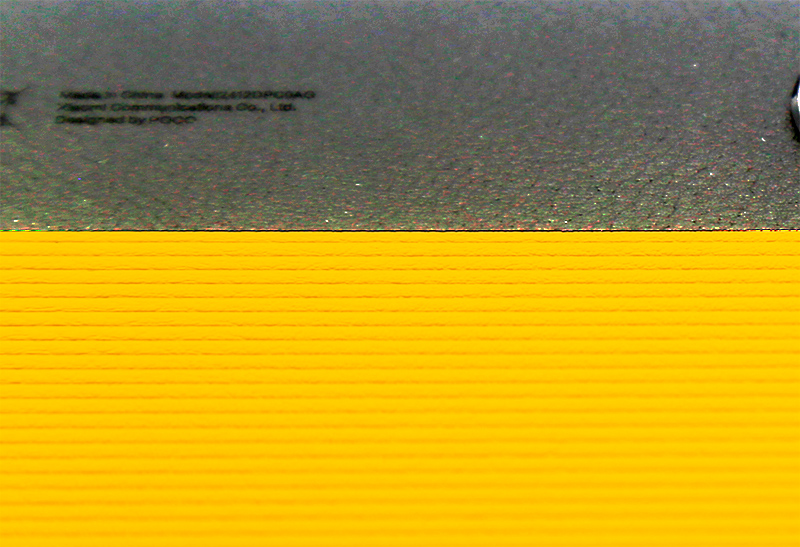 Задняя крышка - матовый пластик с интересной текстурой: левая, черная часть имеет текстуру "под кожу", правая, желтая часть, имеет текстуру из вертикальных выступающих полосок.