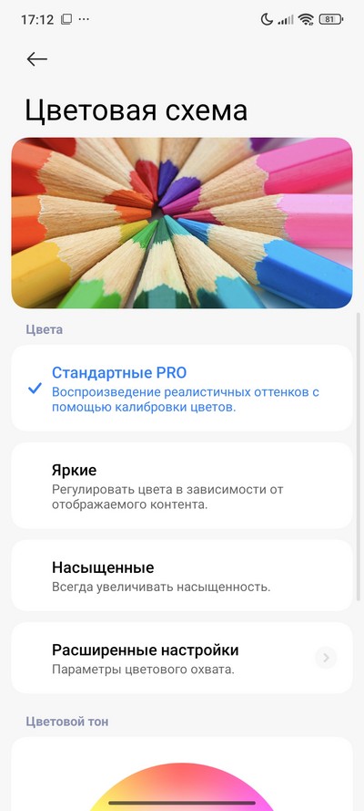 Настройки дисплея. Есть светлый и темный режимы, режим чтения (теплые цвета), настраиваемый по расписанию.