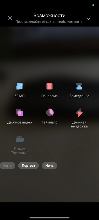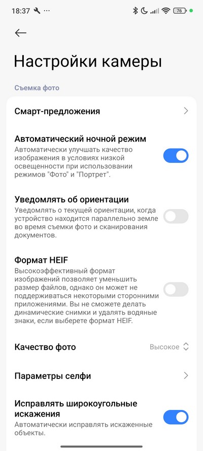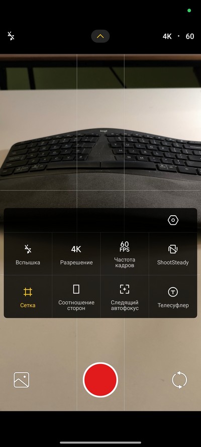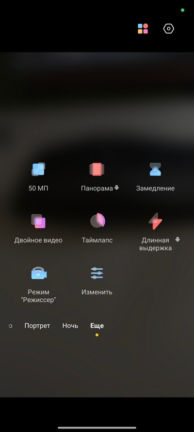 Интерфейс камеры. Снизу переключаются режимы: профи, документы, видео, фото, портрет, ночь и еще (набор настраивается). Выше переключение между сверхшириком, основной камерой и цифровым зумом (по умолчанию 2-кратный или 4-кратный, но можно вызвать линейку зумов и масштабировать до 10-кратного). Сверху - пиктограммы различных переключателей и пиктограмма меню. На правом скриншоте - окно меню с настройками.