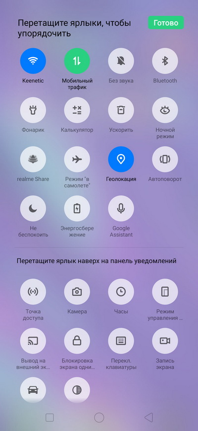 Android 10, оболочка Color OS 6.0 (разработка компании Oppo). Главный десктоп и область быстрых переключателей.