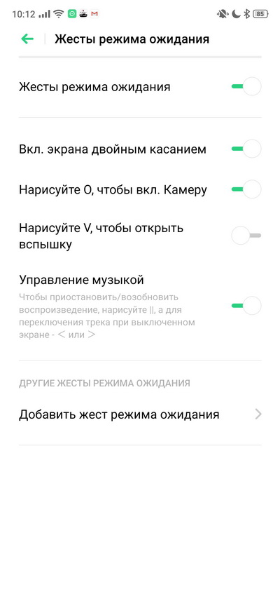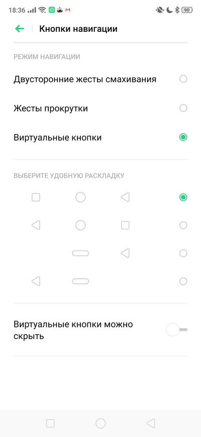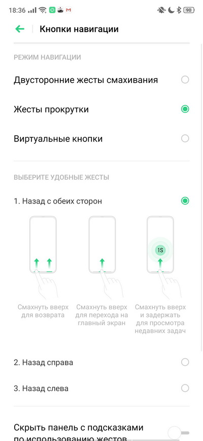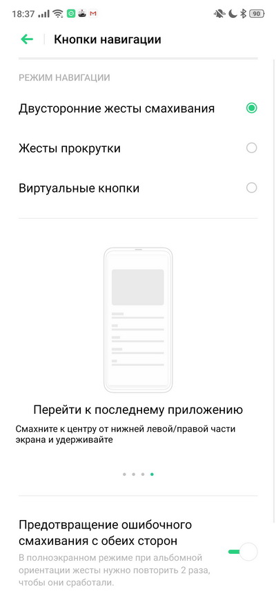У Realme традиционно предлагается несколько вариантов управления: обычные три экранные кнопки, две экранные кнопки (основная поддерживает жесты), жесты прокрутки и двусторонние жесты смахивания.