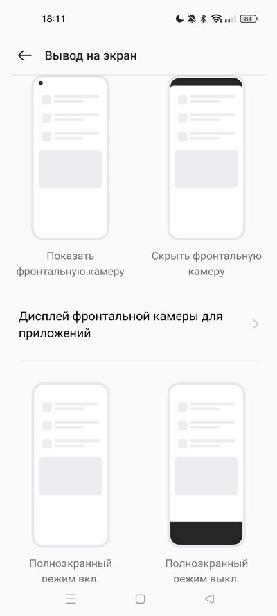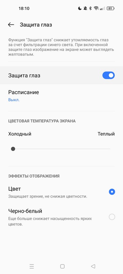 Есть режим защиты глаз по расписанию, режим сокрытия фронтальной камеры.