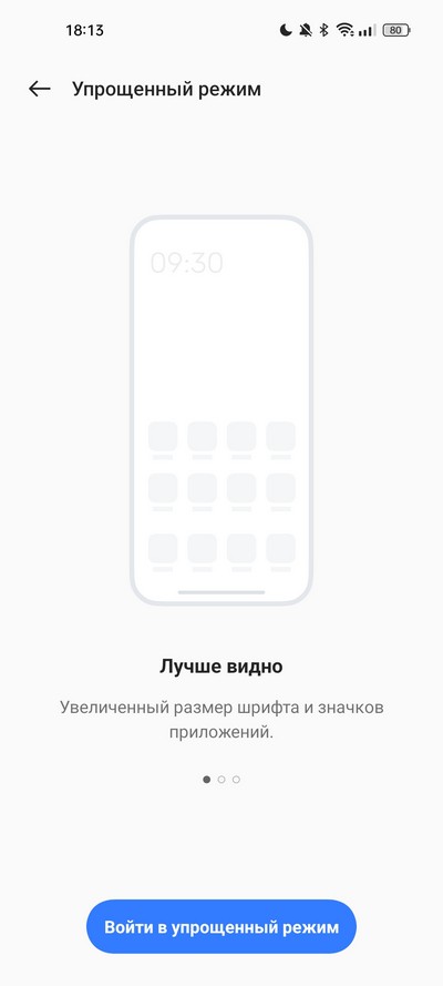 Упрощенный режим с крупными пиктограммами и крупными надписями.