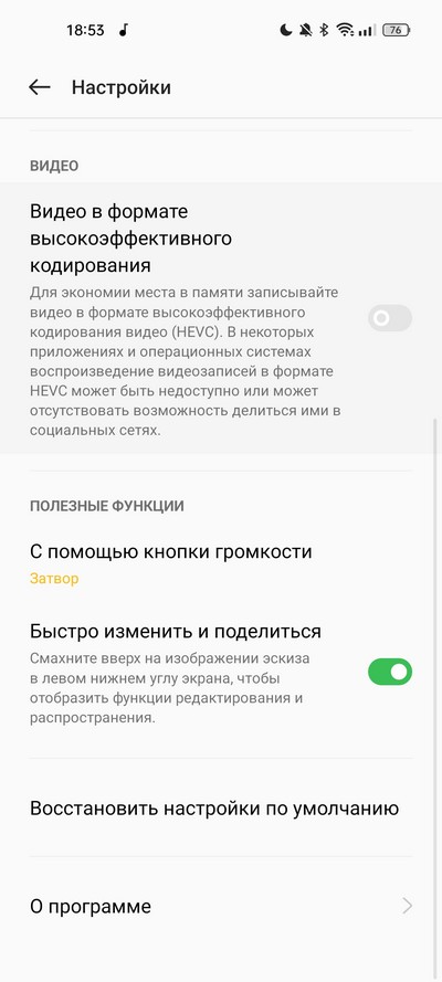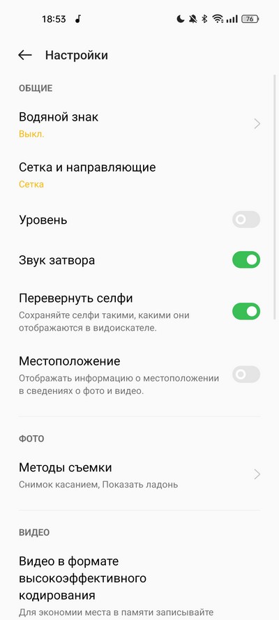 Видео. Тут можно включать режим так называемой суперстабилизацим (при этом никакой обычной стабилизации в настройках нет), для этого режима видео будет записываться строго в Full HD.