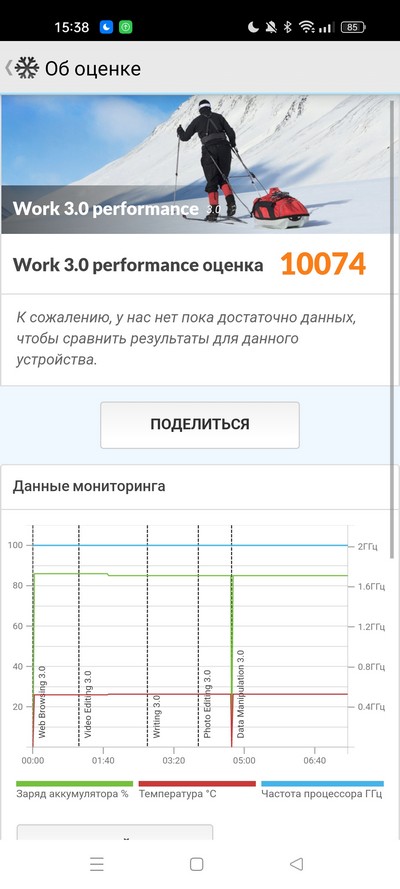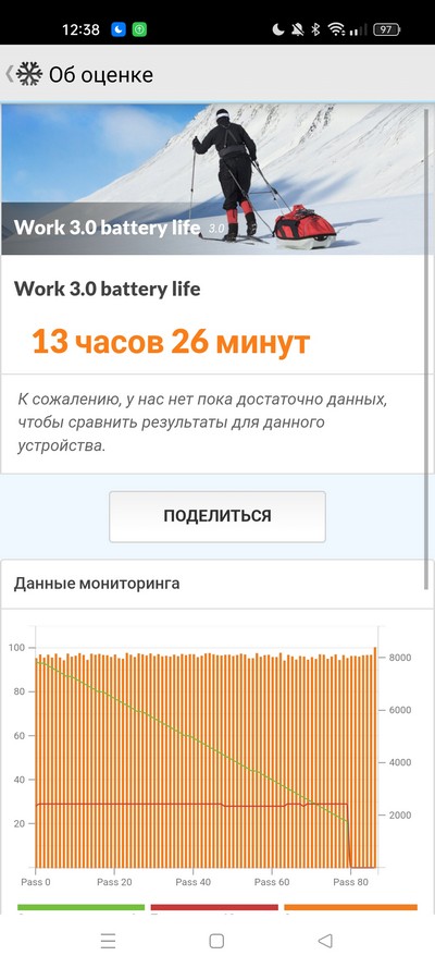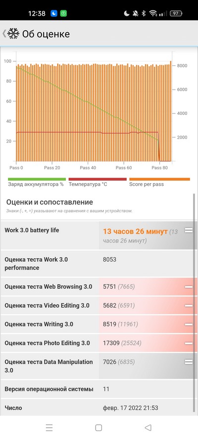 Синтетический тест PCMark - важный показатель. 13,5 часа - в общем, хорошо: это показывает, что под высокой нагрузкой смартфон продержится хотя бы полный день.
