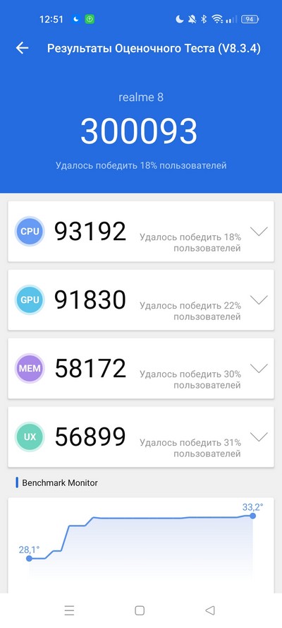 Стресс-тест по AnTuTu. Температура не превысила 38 градусов - это хорошо.