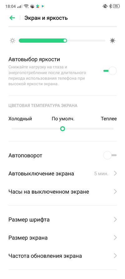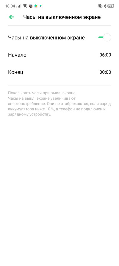 Есть регулировка цветовой температуры, также присутствует режим Always On, когда смартфон на выключенном экране неярко выводит время, дату и процент заряда аккумулятора.