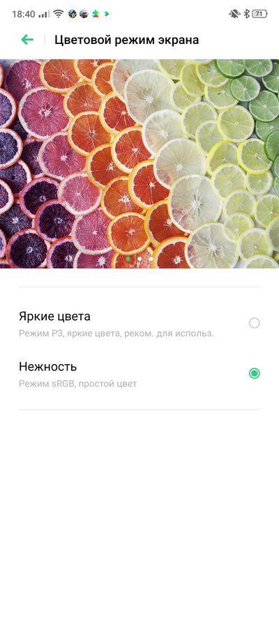 Частоту обновления можно менять с 90 на 60 Гц - для экономии заряда. И есть два цветовых режима: обычные цвета и насыщенные.