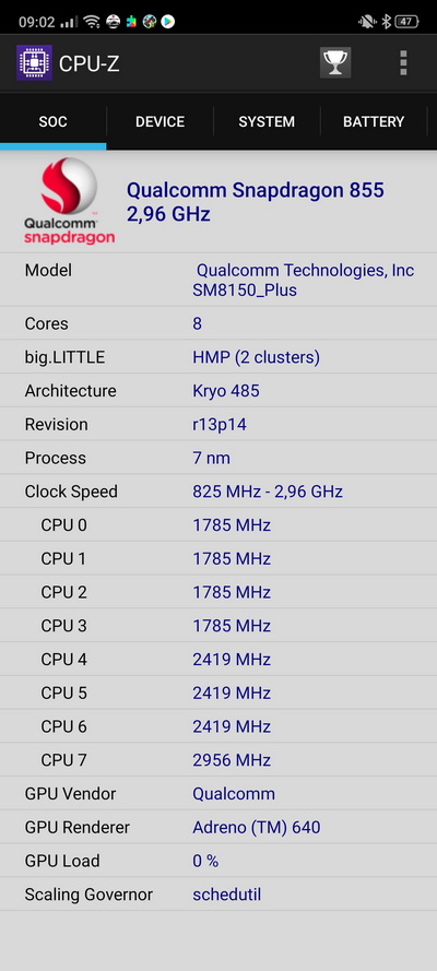 Платформа: Qualcomm SDM855 Snapdragon 855+ (7 nm), Octa-core (1 × 2.96 GHz Kryo 485, 3 × 2.42 GHz Kryo 485, 4 × 1.8 GHz Kryo 485)