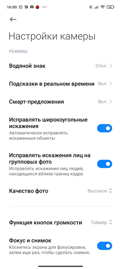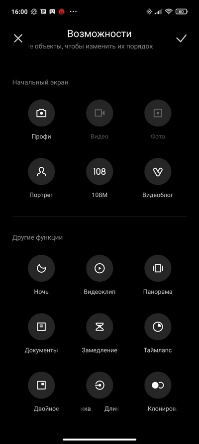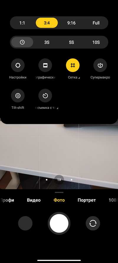 Интерфейс камеры. Снизу переключаются режимы: профи, видео, фото, портрет, 108 Мпикс, видеоблог (Vlog), и их набор настраивается. Выше переключение между сверхшириком, основной камерой и цифровым зумом (по умолчанию 2-кратный, но можно вызвать линейку зумов и масштабировать до 10-кратного). Сверху - пиктограммы различных переключателей и пиктограмма меню. На правом скриншоте - окно меню с настройками.