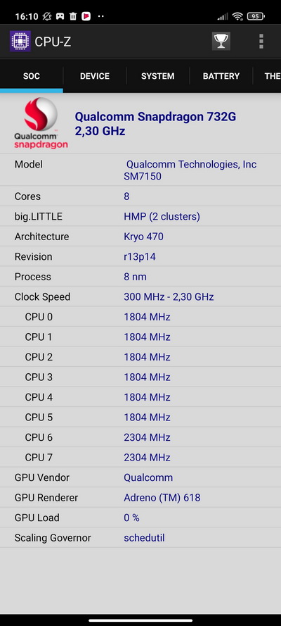 Процессор: Qualcomm SM7150 Snapdragon 732G (8 nm), CPU Octa-core (2x2.3 GHz Kryo 470 Gold & 6x1.8 GHz Kryo 470 Silver)