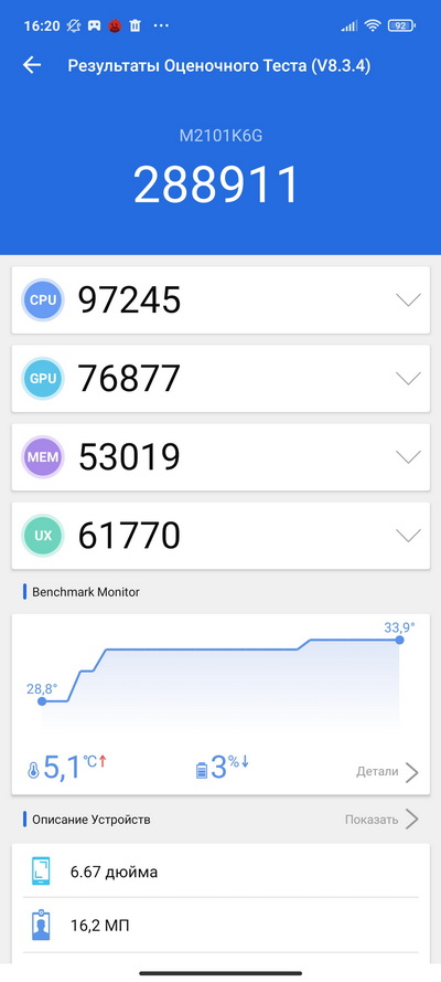 Стресс-тест по AnTuTu. Температура выше 38 градусов не поднималась.