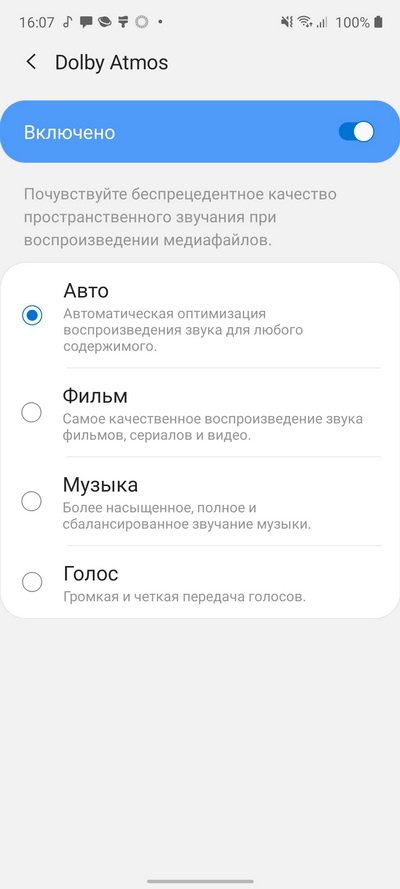 Здесь поддерживается режим Dolby Atmos, который, цитирую, "обеспечивает беспрецедентное качество пространственного звучания". На деле включение этого режима только ухудшает качество - звук становится еще более глуховатый и ватный.
