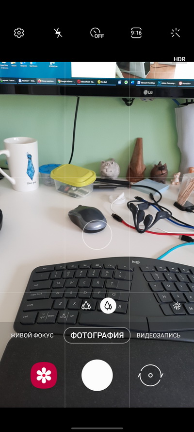 Более или менее стандартный для современных смартфонов интерфейс. Панель настроек сверху, кнопки переключения камер снизу, под ними переключение режимов.