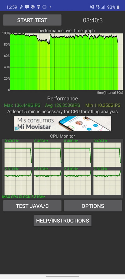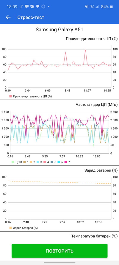Тест на троттлинг. Все в порядке, производительность под нагрузкой практически не падает.
