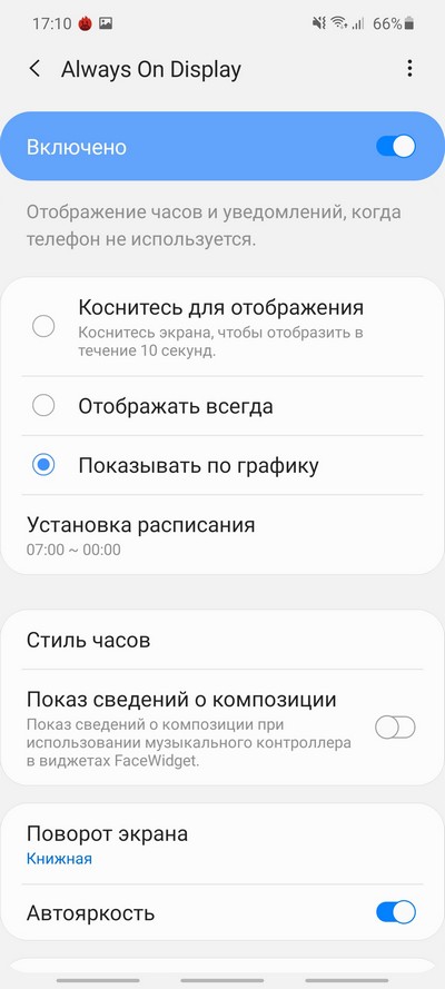 Это AMOLED, поэтому здесь есть режим постоянно включенного экрана (AOD - Always On Display), который гибко настраивается.