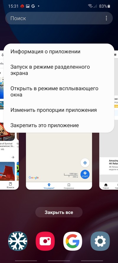 При длинном нажатии на пиктограмму открытого приложения появляется меню, в котором можно запустить приложение в режиме разделенного экрана, открыть в режиме всплывающего окна, изменить его пропорции или закрепить приложение в памяти.