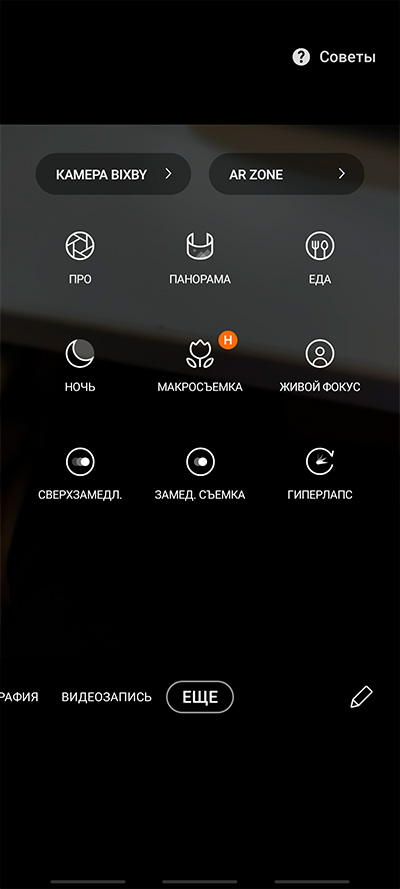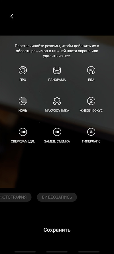 Дополнительные режимы в разделе "Еще": они настраиваются, там нужные режимы можно перетаскивать на нижнюю панель.