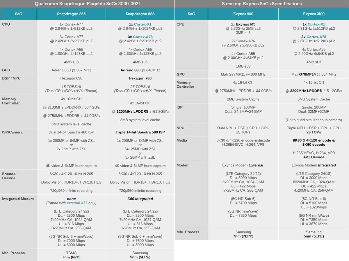 Как обычно, компания выпустила две модификации данного смартфона: на собственной платформе Exynos 990, с которой смартфон поставляется на азиатский и европейский рынки, и на платформе Qualcomm Snapdragon 865, которая предназначена прежде всего для американского рынка, - она в своем названии имеет пометку 5G. Вот здесь можно посмотреть сравнение данных платформ.